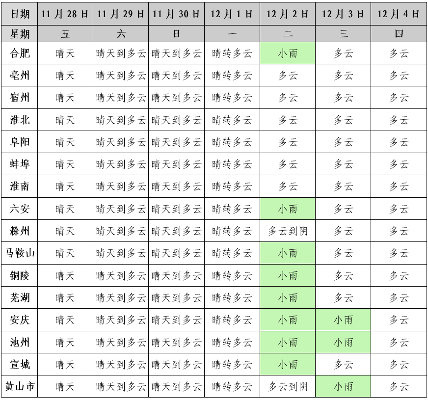安徽省气象台最新预报:未来一周,安徽气温先升高后下降。 30日前全省气温将回升。 30日夜间至12月3日,全省平均气温将下降8~10℃,部分地区超过11℃。下周全省天气以多云到晴为主。 12月2-3日,全省南部地区仅有小雨,山区有软雪或小雪。 30日前全省气温回升,其中惠河以南地区最高气温29日、30日升至20~22℃,江南部分地区超过23℃。受冷空气影响,30日夜间至12月3日,全省平均气温下降8~10℃,部分地区在11℃以上。同时,全省偏北风4级,阵风7级左右。最低气温冷空气过境后4日上午:淮北至吉安淮东部地区-5~-3℃,其他地区-3~0℃。下周具体预报:28日:全省天气晴。 30日29日,全省晴转多云。 12月1日,全省天气由晴转多云。 2日:淮北多云;惠河以南多云,部分地方有小雨,傍晚大别山有雨夹雪或小雪。 3日:长江以北多云;江南地区多云到多云,部分地方有小雨,山区有平或小雪。第四天:全省多云。未来一周城市天气预报
