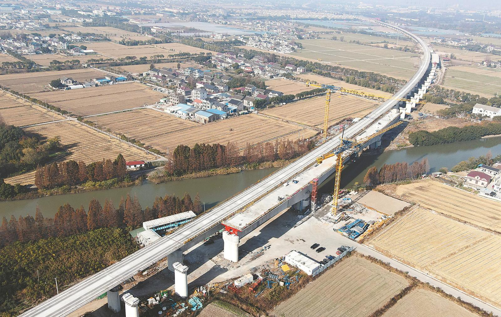 11月30日拍摄的沪宁豫高铁特大桥跨蒲花塘连续梁中段合龙施工现场(无人机照片)。当天,中铁四局承建的沪宁豫港高铁穿越普华塘连续梁中部段顺利合龙。沪宁合肥高铁是沪渝渝高铁的东段。担负着沿江干线路网、沿海及直通上海的京沪走廊的客流承载任务。项目建成后,将打造上海、南京、合肥都市圈之间的高铁新通道,优化沿江铁路网布局,推动长三角一体化高质量发展。新华社报道 摄方哲